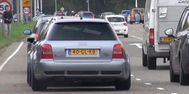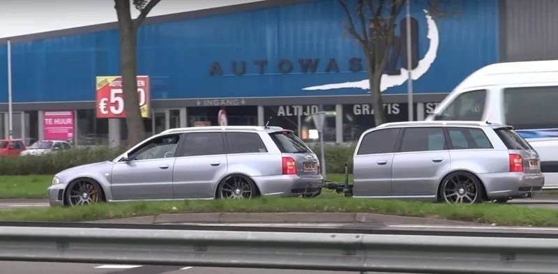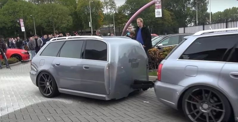 近日,欧洲那边的街道上(貌似是荷兰)出现一辆(或者应该说1.5辆)外型相当抢眼的奥迪RS4 Avant,相比于特别改装的Limousine加长型礼宾车,这位车主用了一个完全不会影响现有车体的方式大幅增加车室空间,那就是在现有的奥迪RS4 Avant后面再拖着半辆奥迪RS4 Avant!