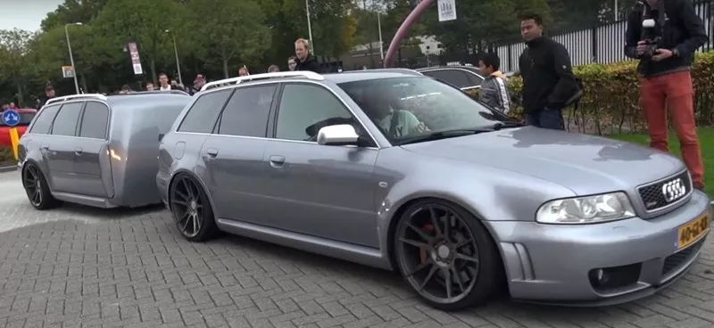 虽然说把车体切割挂在车尾当拖车,在车体改装界中并不是首见,不过在一辆德系性能旅行车后面还拖着一辆(半辆?)一模一样的半节车厢,仍是非常罕见新奇的事情,也不禁让人想坐进去后面那半截车厢,用另一种方式感受初代奥迪RS4 Avant 375hp的推背感!