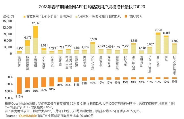 下图是QuestMobile统计的春节期间全网日活增长最快的APP,可以看到,在2月15日到2月21日期间,抖音的日活增长了3000多万,在全网APP中排名第二。