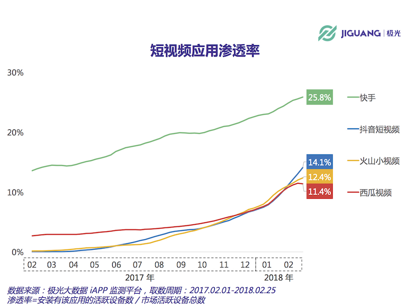 在巨额资金的支持下,快手与头条系产品均保持着相当高的增速。下图是极光大数据提供的今日头条旗下三款App和快手自去年2月到今年2月的渗透率增长曲线。