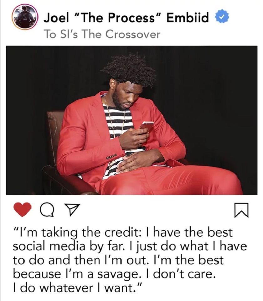 除了詹姆斯,许多年轻球员也已经意识到Ins的重要性,乔尔·恩比德一度在社交平台上疯狂“刷存在感”,他现在的粉丝数也已经超过了190万,在球场和Ins上都取得了成功。“字母哥”阿德托昆博则因为他那“魔性”的笑容以及频繁的粉丝互动而收获了24万粉丝。