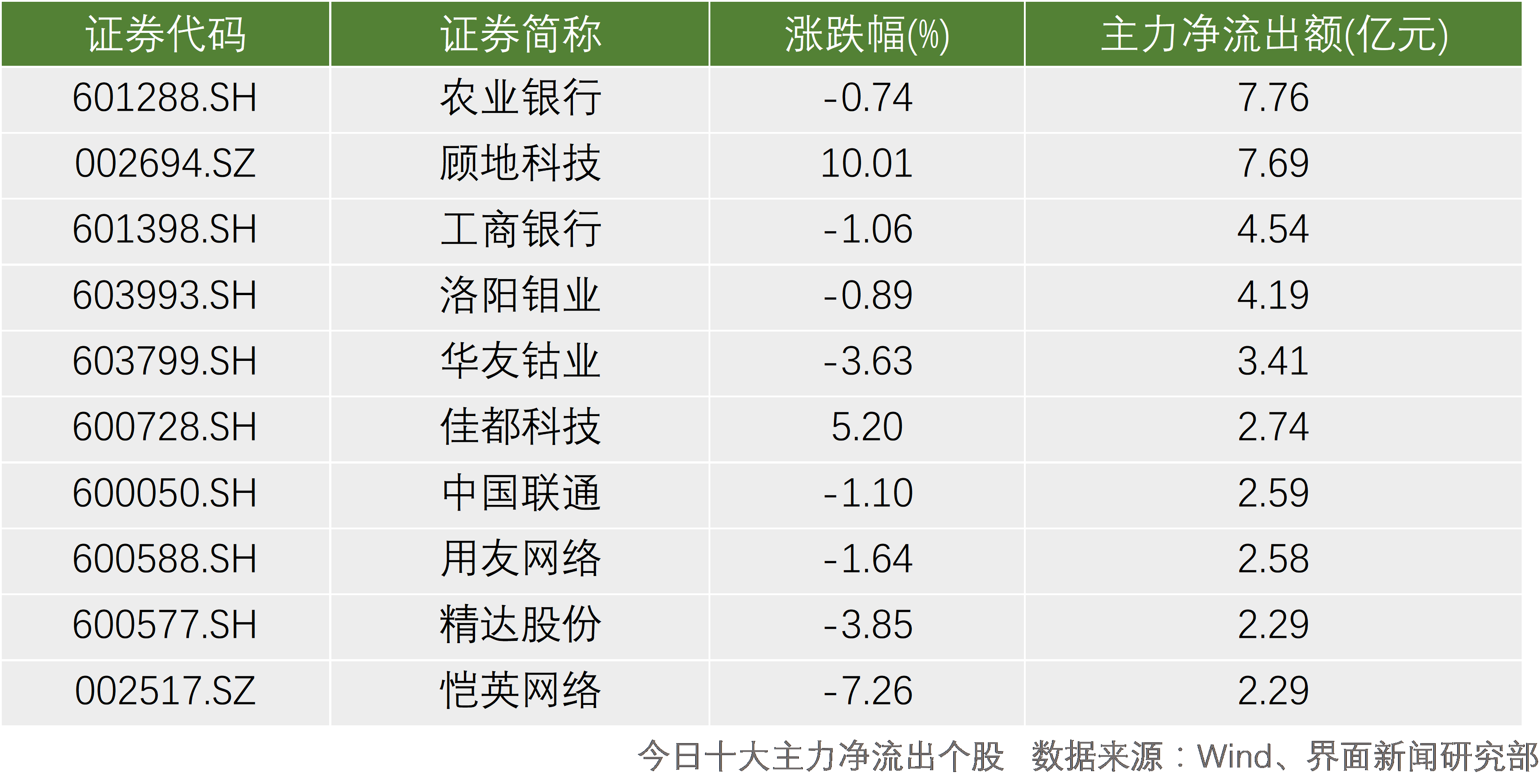 农业银行(601288.SH)、顾地科技(002694.SZ)、工商银行(601398.SH)成为主力资金今日重点抛售对象,分别净流出7.76亿元、7.69亿元、4.54亿元。顾地科技此前连续6个交易日跌停,今日尾盘涨停但仍获主力资金大额流出。佳都科技(600728.SH)此前连续两日涨停,3月5日公告澄清后今日遭遇主力流出。恺英网络(002517.SZ)3月5日公告终止重大资产重组,今日复牌遭主力抛售。