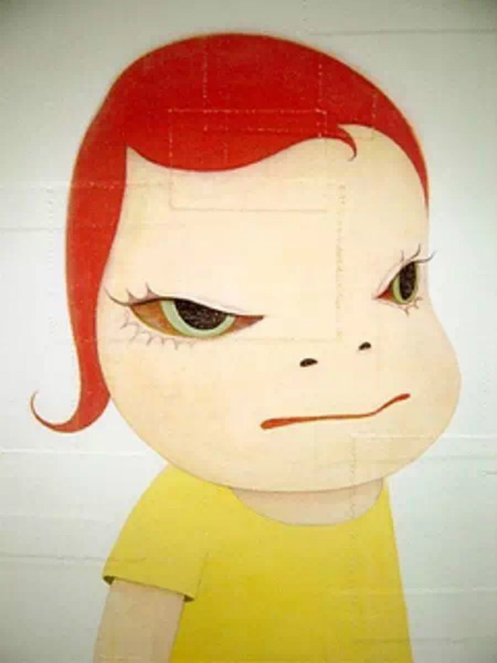 在奈良美智的作品中,这位叫Mori的小女孩有着圆圆的大脑袋,肉嘟嘟的圆脸和占据三分之一脸部面积的大眼,但这些于她并不是宫崎骏笔下日式萝莉的萌系配置。相反,Mori看起来十分邪气,睥睨的双眼毫无顾忌地释放凶恶与孤僻,强硬的目光与《三块广告牌》剧中女主简直如出一辙。当然,一个可爱的萝莉即使作凶狠状也还是可爱,而在奈良美智的其他作品中,Mori也会流露出正常的表情,甚至会甜甜地卖个萌。
