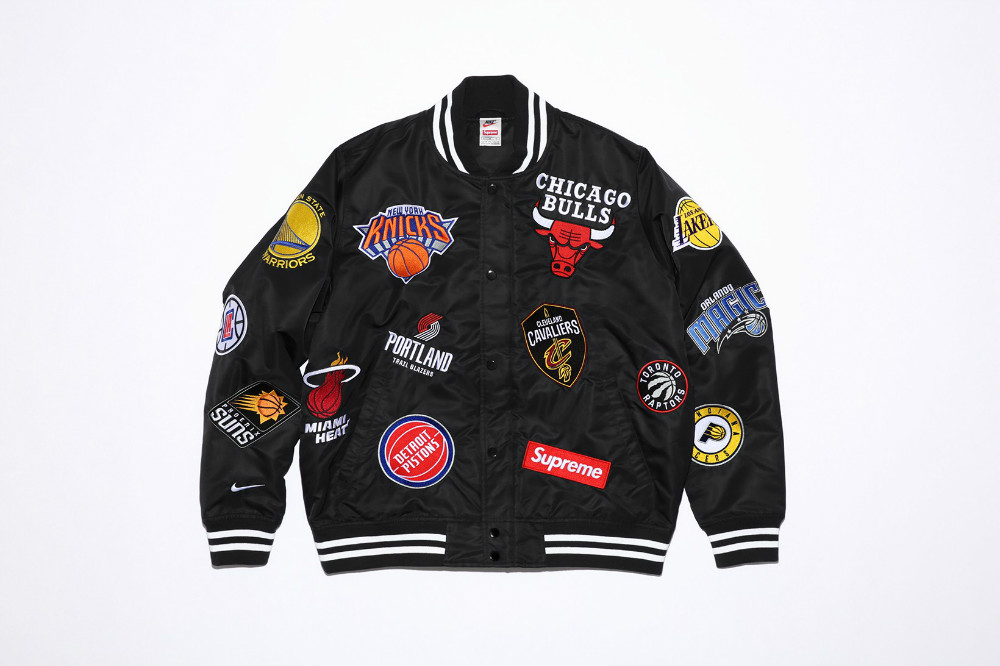秉着“人人参与”的和平精神,该系列将芝加哥公牛、迈阿密热火、休斯顿火箭等30 支球队的队徽,以及 Supreme 招牌Box Logo随机布满单品之上,形成一种有趣的无序状态,刻意模仿00 年代流行的绣满 NBA 球队 Logo 布章的纪念商品造就一种失真感和复古格调。