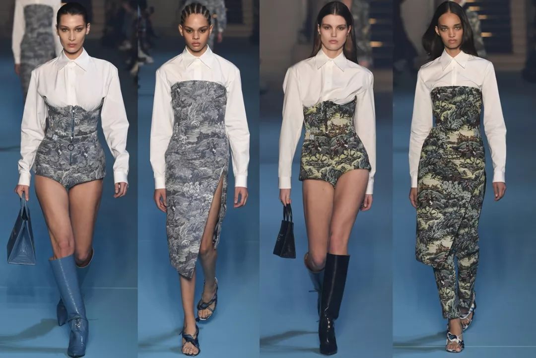 向来不太喜欢印花的Off White却破天荒的上了一波 印花单品,还让Bella一开场就穿了出来。只不过干净利落的直线条+抹胸,搭配职业感的衬衫,犀利依旧,并不柔情。
