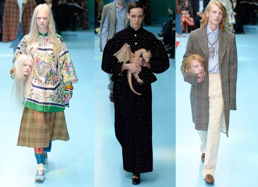 而特别知道如何玩转噱头还设计两不误的Gucci,让模特抱着自己的头走场,甚至在ins上引起了一阵效仿热……