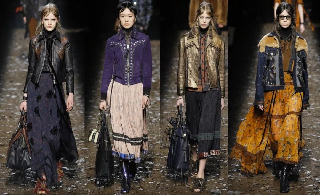 最擅长做皮夹克和皮毛一体的Coach,虽然今年一下子大玩吉普赛,色彩暗淡得有些颓。不过用各种皮衣搭配各种印花长裙的老套路就走一场秀,却也值得提出来说说。