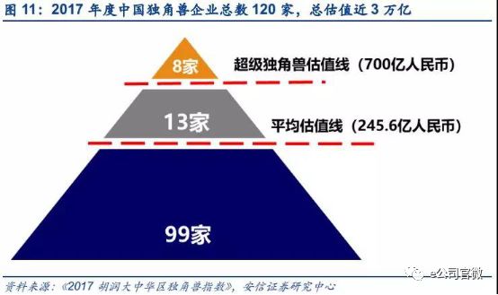 据统计,去年中国全体独角兽企业上榜共120家,总体估值近3万亿元,主要集中在互联网服务、电子商务、互联网金融领域,占比约一半。