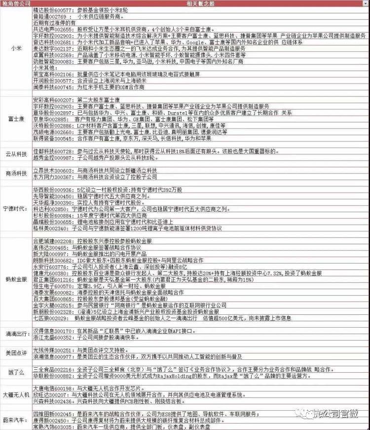 当前二级市场,投资者竭力寻找具备“独角兽”潜质、存量“独角兽”、参股“独角兽”的公司以及供应链公司,富士康、小米、蚂蚁金服等新经济独角兽类企业登陆A股的进程,“独角兽的小伙伴”成为市场关注的焦点。