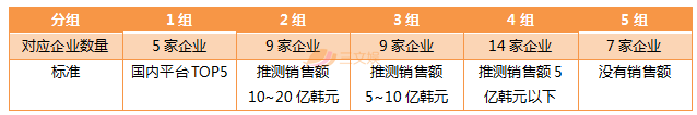 参加调查企业的销售规模为“2014年199.4亿韩元”、“2015年567.4亿韩元”、“2016年991.1亿韩元”,以年平均129.6%的涨幅递进。特别注意,一是由于各个平台商的销售构成要素或细分领域以及相关的大数据资料作为企业内部资产公开比较困难,二是有部分平台拒绝了调查,为此在经过对相关人士的采访和大量调查后,根据销售额的不同可以划分为5组,进而综合得出整体的市场规模。