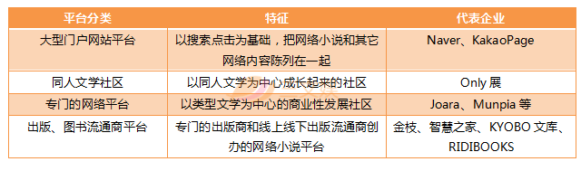 目前在韩国国内,具有代表性的网络小说平台可分为四大类,分别是大型门户网站平台、同人文学社区、专门的网络内容平台以及属于后起之秀的出版社和图书流通商的网络平台。