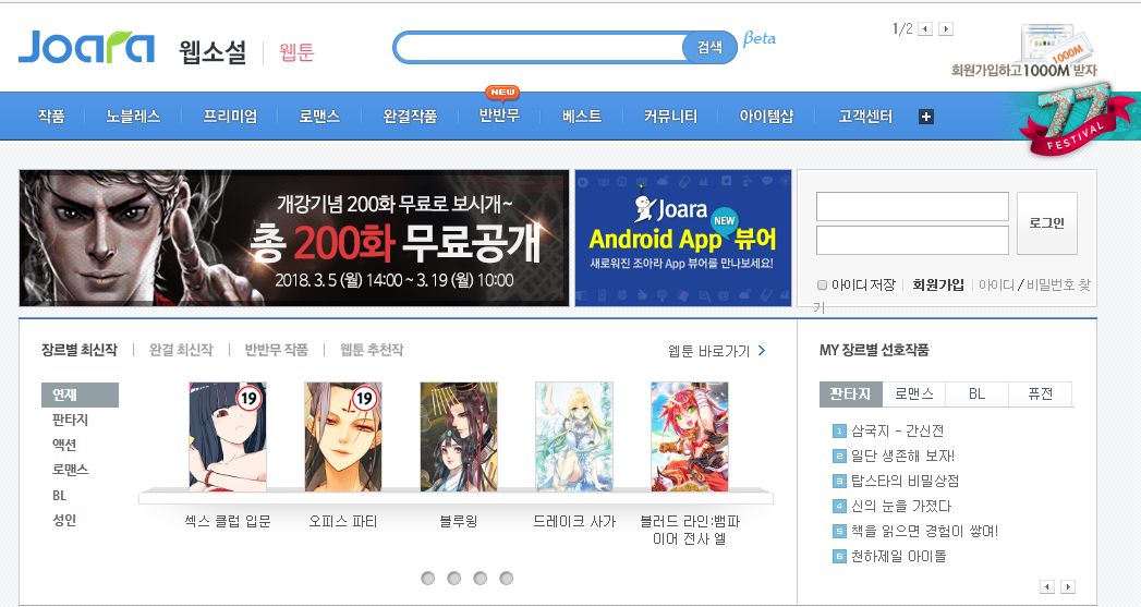 Joara作为韩国发展时间最久的网络小说平台,成立于1999年4月6日。该平台提供多样题材小说作品的同时,核心定位为恋爱小说。此外,相比PC端,其用户更偏向于移动端进行浏览,比例可达91%。截至2017年4月,在该平台上连载的作品累计达到46万部,篇幅平均达到950回,代表作品有《记忆》、《我是贵族》等。