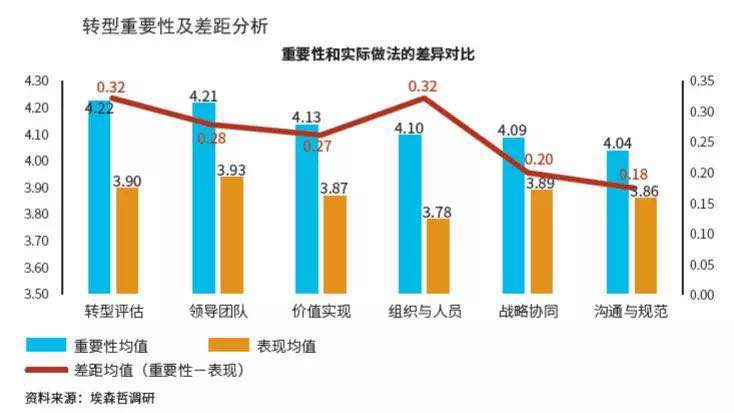 调查显示,在影响民营企业转型的六个重要因子中,转型评估、组织与人员、领导团队三项的受重视程度与现实表现之间的落差最大,分别为0.32、0.32和0.28。