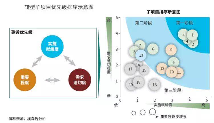 2.转型路径:缺乏未雨绸缪的转型路径,会使转型工作走向两个极端:一是管理层缺乏转型全局观和决策章法;二是管理层想法各异,指令多元,轻则不欢而散,重则出现利益博弈。埃森哲建议:企业全面梳理转型所涉及的各个项目模块,根据优先级、重要性和就绪度做出排序,依照目前系统能力、业务能力和服务能力的成熟度规划路径、配置资源。