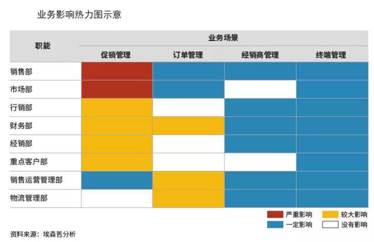 通常,埃森哲会把转型按照业务场景或职能分为若干模块,再详细列举出每个模块下的业务变化,包括这一变化带来的影响所涉及的岗位和覆盖范围,继而对每一项业务变化的影响程度从组织变化层面、业务(或流程)变化层面和系统(或操作)变化层面做出打分,再根据数据模型得出业务影响的热力地图。