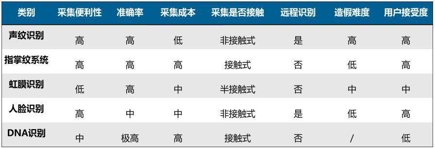 和指纹、人脸、虹膜等其他生物识别方式相比,声纹识别有许多天然优势。