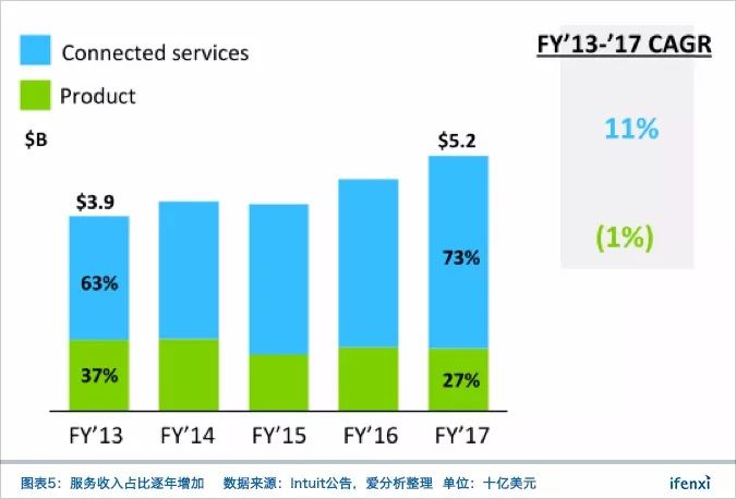 伴随着产品形态的改变,Intuit自身的商业模式也发生了改变,从软件产品收入为主转变为订阅服务收入为主。2017财年,连接服务(Connected Services)产生的收入为38亿美元,主要是订阅服务收入,占到了总收入73%。而这项收入在2008年仅为15亿美元,占当年营收50%,再往前的2000年,这一比例更是只有27%。