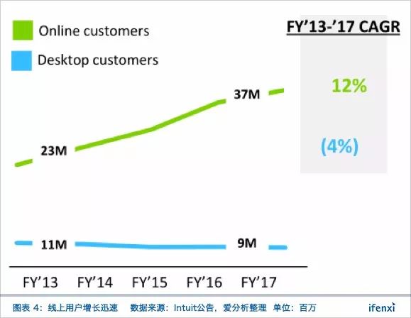 截至2017年,Intuit所有产品的在线用户为3700万,桌面用户为900万。与2013年相比,5年共计新增用户1200万,其中云端用户增加1400万,桌面用户减少200万。