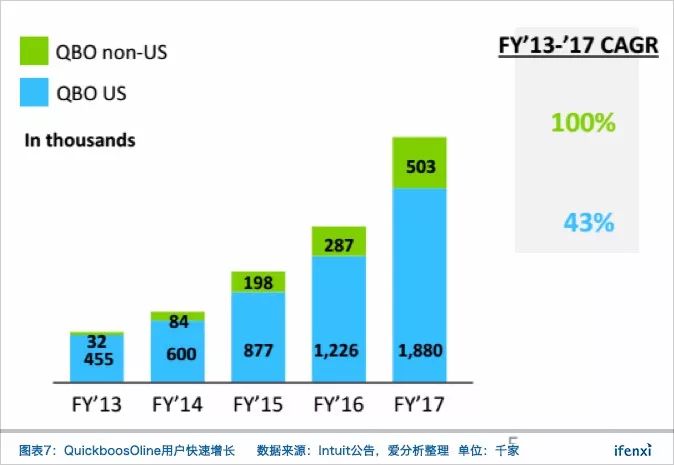 与此同时,QuickbooksOnline开启了全球化的市场战略,相比美国用户,QuickBooks Online的国外用户增长更为迅速,2017年QBO的国外用户为50.3万,同比增长了75.26%。
