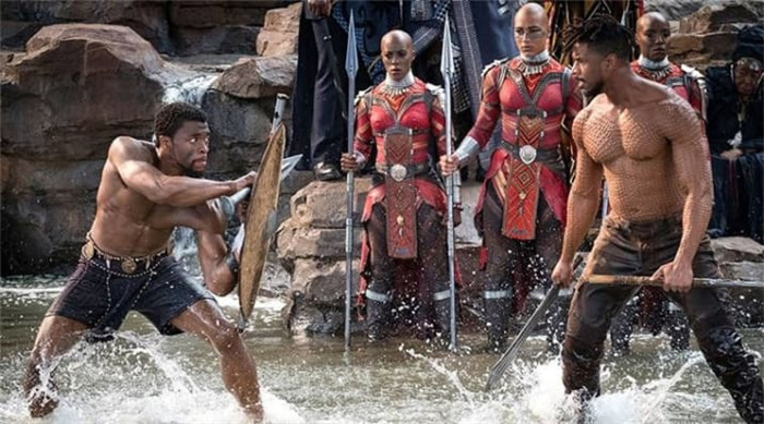 13. 特查拉与姆巴库(M'Baku)的决斗发生在拂晓,象征着新的开始;特查拉与反派克尔芒戈(Killmonger)的决斗发生在傍晚,象征着他的失败。另外,克尔芒戈将特查拉扔下瀑布的情节与漫画中保持了一致。