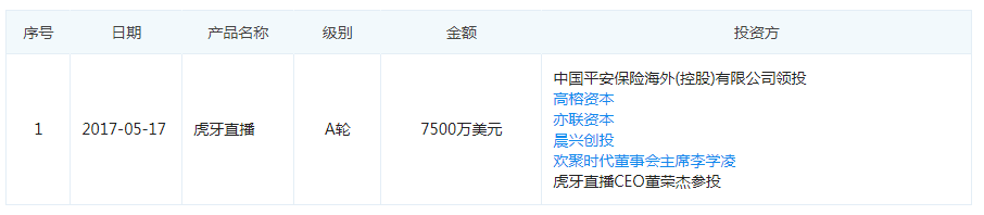 虎牙直播是一家以游戏直播为主的平台 ,前身为YY直播,隶属于欢聚时代,2014年更名为虎牙直播,开始独立运营。2017年5月,虎牙直播宣布获得7500万美元的A轮融资,由中国平安保险海外(控股)有限公司领投,高榕资本、亦联资本、晨兴创投、欢聚时代董事会主席李学凌、虎牙直播CEO董荣杰参投。此轮融资后,欢聚时代仍保持对虎牙直播的多数控股权。