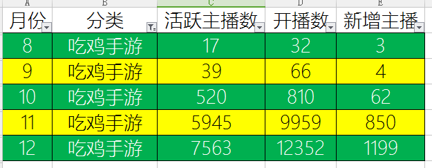 吃鸡手游活跃主播大幅增长,从8月份的17人增加到7563,取得了爆炸性的增长。
