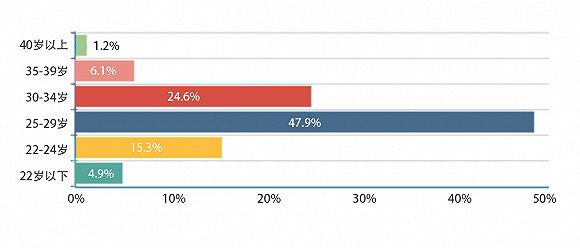 调查显示,近一半的程序员年龄在25-29岁之间,且35岁以上占一成不到。根据搜狐科技网《中国互联网发展简史》显示,中国1994年正式接入国际互联网,最近一次中国互联网大浪潮是在2009年,PC端互联网转移到移动互联网,中国程序员数量呈井喷式发展。这也解释为什么中国程序员大多年龄集中在25-34岁之间。
