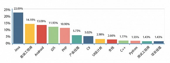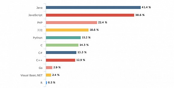 从调查数据可知,程序员擅长语言多为Java(41.4%)、JavaScript(38.6%)和PHP(22.4%)等,另外Python(15.2%)、C语言(14.3%)、C#(13.3%)和C++(12.9%)等也是使用较多的计算机语言。再结合程序员客栈后台4000多名签约开发者的职业方向,与本次调查基本符合。(注:此项为多选,总和大于100%)