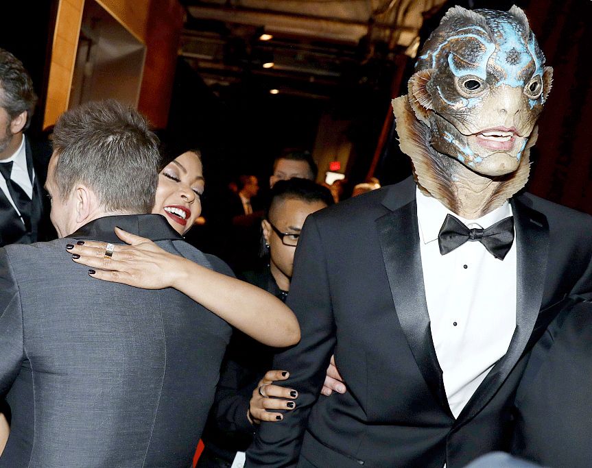 这次各个剧组为了拿奖也是卯足了劲,《水形物语》直接把里面的鱼人搬到了现场,穿得有模有样的。