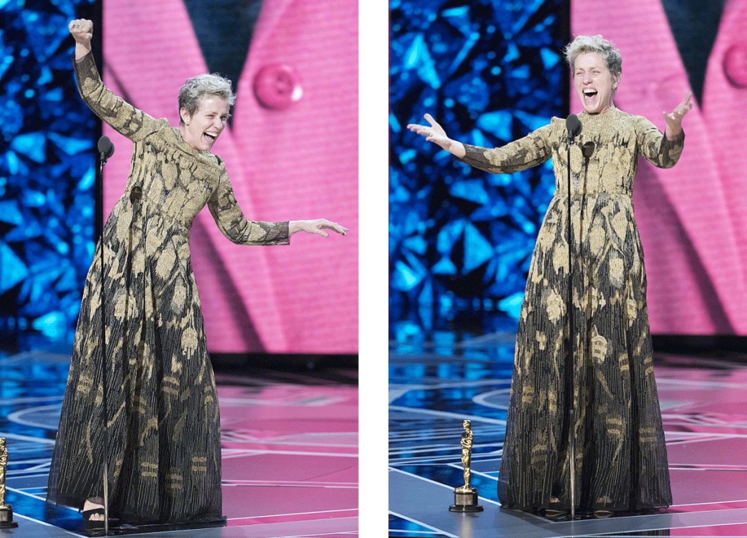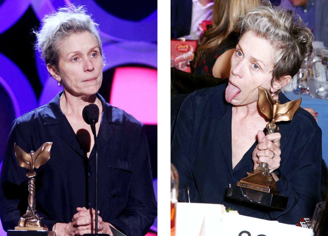 梅姨这次陪跑了最佳女主,这也是她第21次提名,而获得女主的是科恩嫂Frances McDormand。她超有个性,昨天的独立精神奖上,她穿着睡衣和一双粉拖鞋就去了领奖了。
