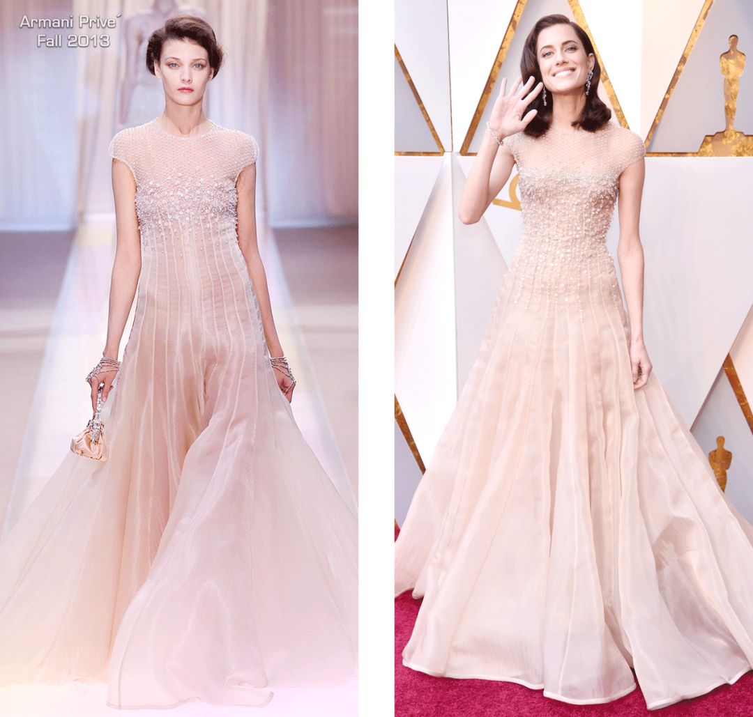 红毯上的潜力股Allison Williams这次反而走起了保险路线,穿着她最喜欢的Armani高定裙,不过这条裙子2013年秋冬系列,上身布满了全手工刺绣的水晶。