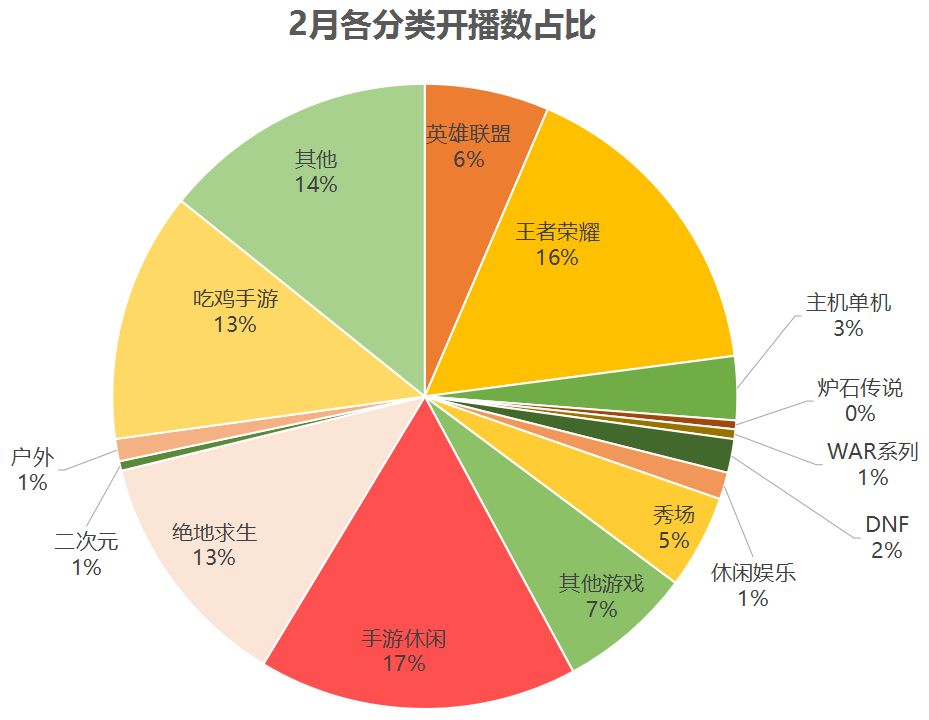 从整体来看,1月和2月各平台的直播分类没有较大幅度的调整。熊猫是最先把绝地求生纳入单独分类的平台,从目前来看,熊猫的绝地求生在整个平台的布局排第一,在全平台的比重也最高。