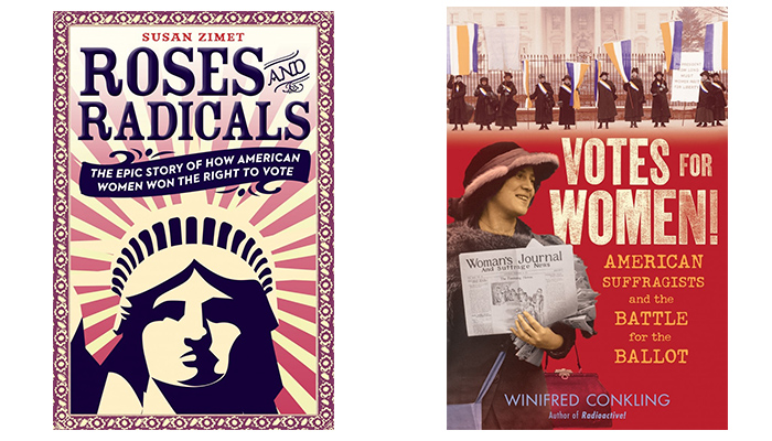在《玫瑰花与激进派:美国女性赢得选举权的史诗》(Roses and Radicals: The Epic Story of How American Women Won the Right to Vote ,适合10岁以上的读者阅读)中,苏珊·齐梅特(Susan Zimet)从几十年的历史中精挑细选出了几位中心人物,即伊丽莎白·凯迪·斯坦顿(女权运动先驱,提出了美国首个倡导妇女应有投票权的运动纲领)、苏珊·布朗奈尔·安东尼(妇女禁酒运动组织创始者之一,曾因在总统大选中带领女性投票被捕)和爱莉丝·保罗(女权运动领袖,全国妇女党城创建人之一),同时她还提到了一些同样对妇女权益进步贡献良多的女性,例如玛莉·渥斯顿克雷福特(Mary Wollstonecraft,英国女权活动家、作家),索杰娜·特鲁斯(美国著名人权卫士)和玛蒂尔达·乔斯林·盖奇(美国19世纪女权活动家、作家)。