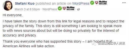 一位叫做Stefani的网友亲历了事件的整个过程,她将全部经过写在了Facebook上,希望将更多的人这篇文章,并转在社交网络上,以此增加影响力,给航空公司施压,给两位满身只是伤的中国老人讨回公道!