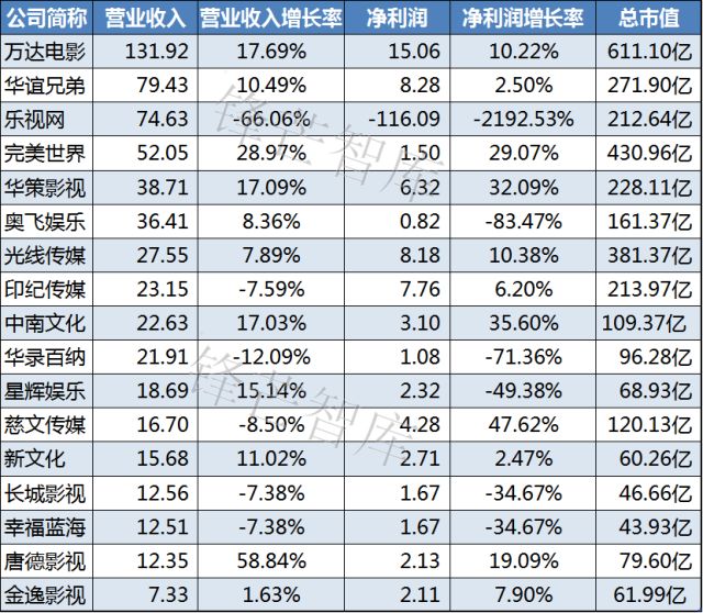 万达电影、华谊兄弟、光线传媒等电影巨头的业绩维持着稳定增长。市值最为庞大的万达电影依旧在收入利润金额上傲视群雄,营业收入达到131.92亿同比增长17.69%,净利润15.06亿元同比增长10.22%。万达电影自2017年7月4日起因重大资产重组停牌,重组目标万达影视业务包括电影、电视剧投资、制作及发行,以及网络游戏发行运营,但不包括前期亏损的传奇影业。