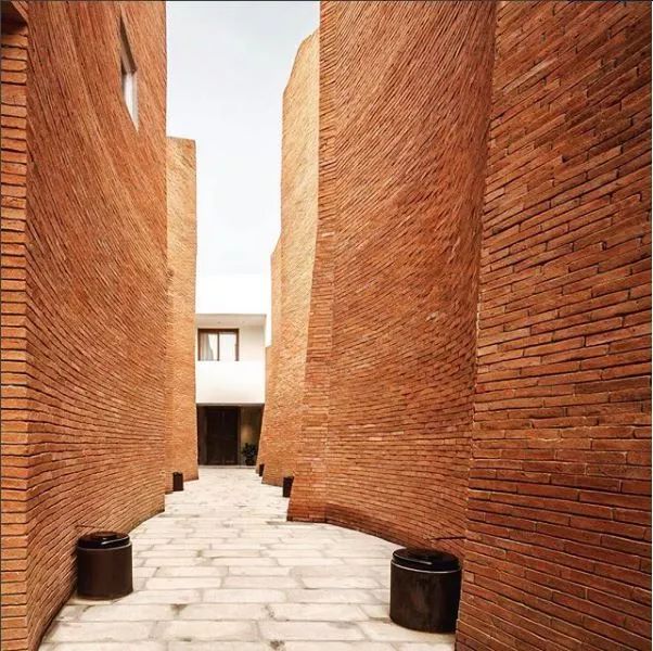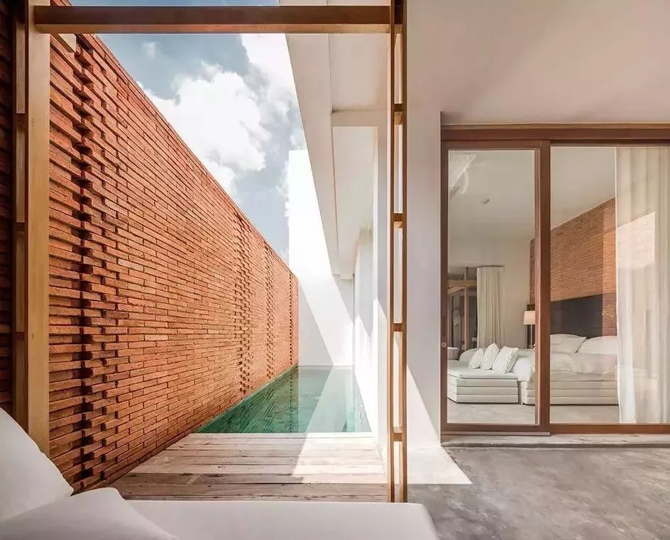穿过这些红砖墙就是酒店的游泳池了,纯白色的几何墙体和淡蓝色的泳池,非常适合拍摄ins风格的照片了呢~