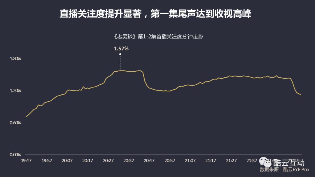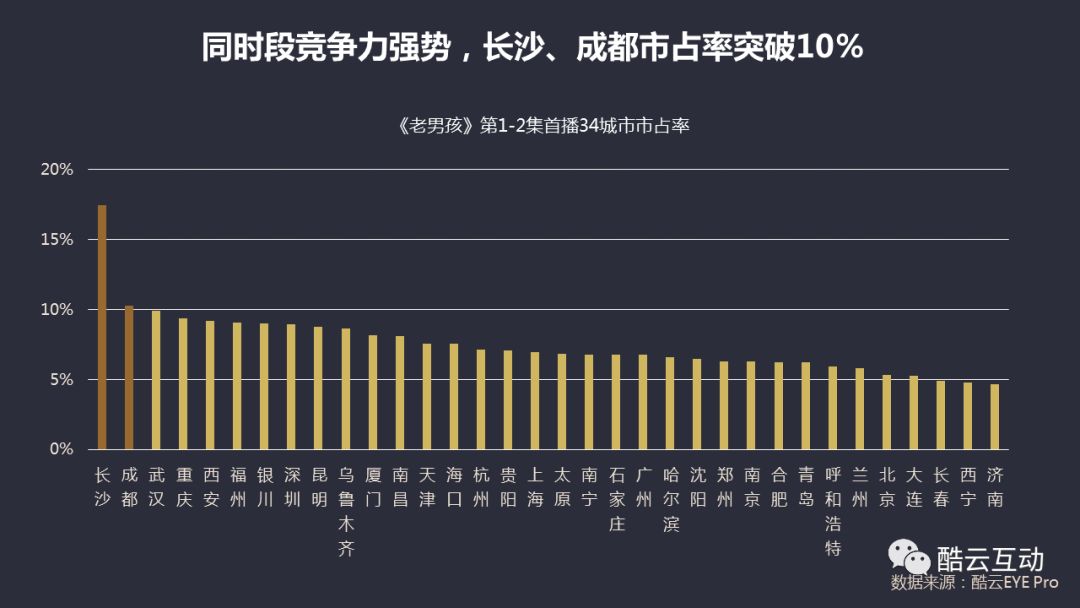 3月4日《老男孩》首集开播,关注度提升显著,第1集仍尾声达到直播关注度高峰1.57%,1-2集平均直播关注度1.31%,市占率7.33%,摘得同时段电视剧桂冠。从分城表现来看,《老男孩》在长沙本地优势突出,成都市占率也突破10%,同时段竞争力强势。