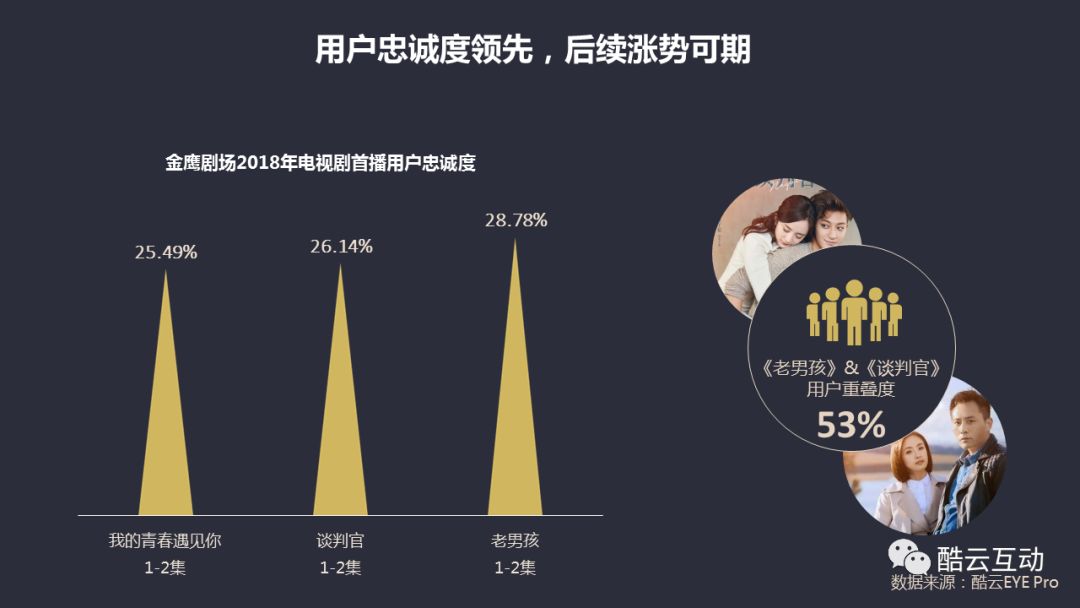 金鹰剧场2018年现已播出3部优质情感剧,均获得亮眼收视表现,首集开播用户忠诚度一路走高。《老男孩》接档热播剧《谈判官》,两剧同样以都市生活为背景,制作品质精良,用户重叠度高达53%,经过《谈判官》的青春梦幻,《老男孩》将观众拉近现实,通过“年少不知爱,知爱不少年”的老男孩吴争,敲醒电视机前的“同龄人”。《老男孩》1-2集获得用户忠诚度28.78%,在同平台首播剧中表现领先,后续涨势可期。