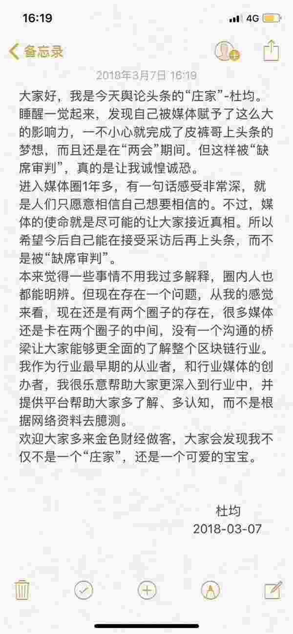 3月7日消息,有媒体于今日发表了《庄家杜均》一文,文章指出金色财经创始人杜均是区块链加密数字货币交易市场的庄家,利用交易所、投资机构以及媒体三位一体的身份加持,操纵币价,收割韭菜, 并揭秘了其背后的产业链。对此,昨日下午,杜均回应称:希望今后能在接受采访后再上头条,而不是被“缺席审判”。