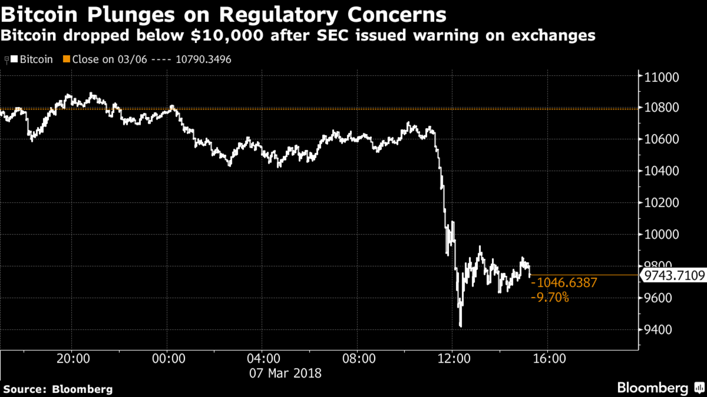 声明发出之后,根据Bloomberg,比特币下跌13%至9,416美元,跌破1万美元以下,相比12月的近20,000美元的高位,已经下跌约50%。