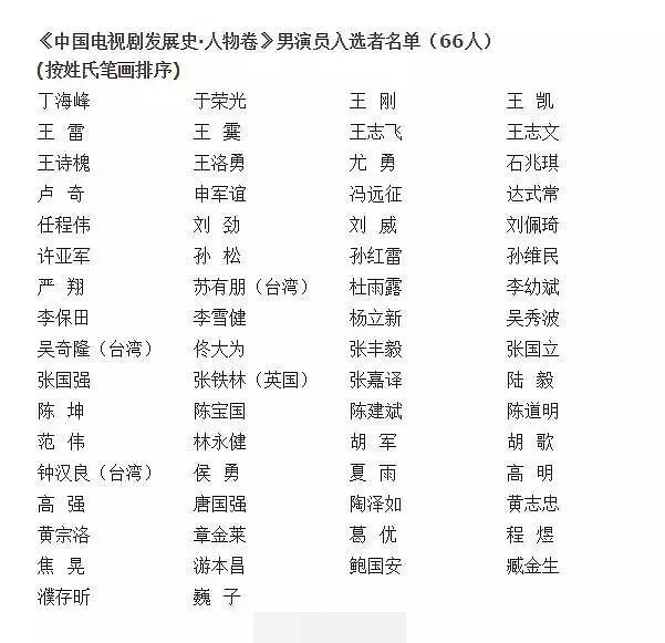 反观《中国电视剧60年大系·人物卷》中的男演员名单,倒是看不到流量明星的出现。前有王刚、濮存昕、张国立等大咖坐镇,后有苏有朋、陆毅、夏雨、胡歌接棒。