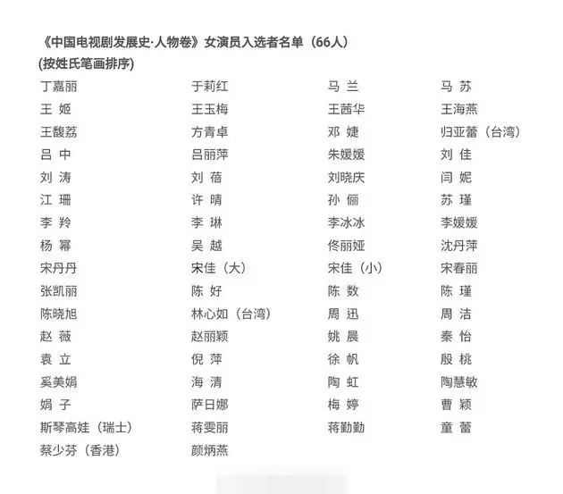 此次,入选《中国电视剧60年大系·人物卷》女演员的有66人,既有陈晓旭、奚美娟、斯琴高娃等老一辈艺术家,也有周迅、赵薇、李冰冰等电影大花。入选的男演员中,有王志飞、王志文、冯远征等实力派,也有钟汉良、吴奇隆、王雷等年轻一代。从这些入选演员的作品和人物影响力看,60年中国电视剧的接棒赛,依旧延续了“有演技,有担当,有口碑”的传承原则。而在其中,“根正苗红”,成为演员们最重要的入选因素。