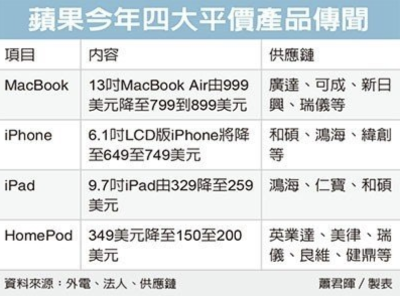 台湾经济日报还给出了包括 6.1 英寸 LCD 屏幕的新 iPhone、9.7 英寸新 iPad 以及更低价的 HomePod 这三款传闻产品的定价预测,详细预测可看下图。