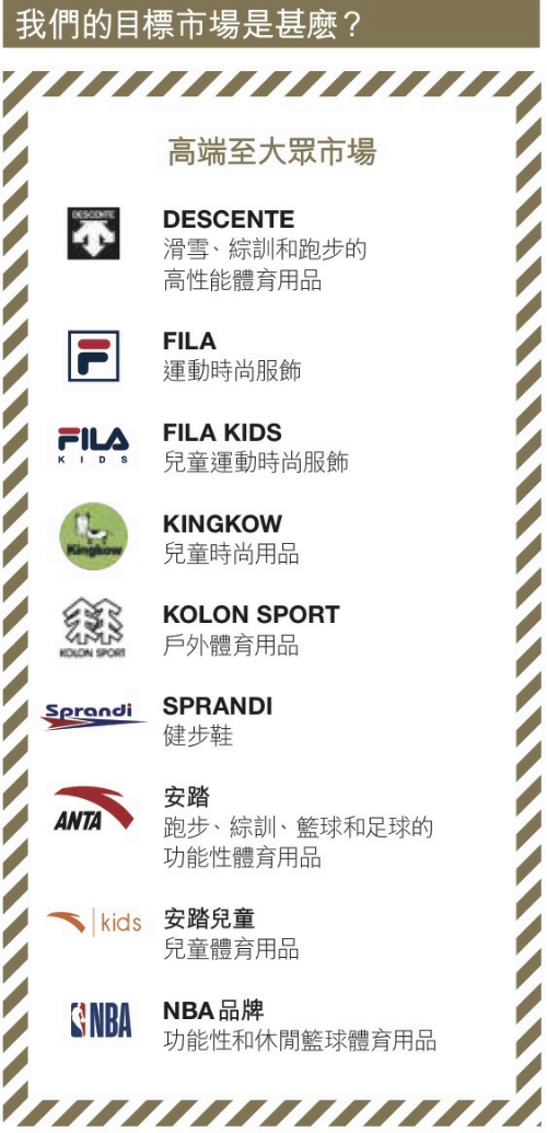 在多品牌战略下,安踏目前在中国拥有经营权的国际品牌有最知名的FILA、韩国户外品牌Kolon、登山运动品牌Sprandi、冬季运动品牌Descente和童装品牌Kingkow等。包括安踏主品牌在内,集团已经大面积覆盖各类体育用品细分市场。