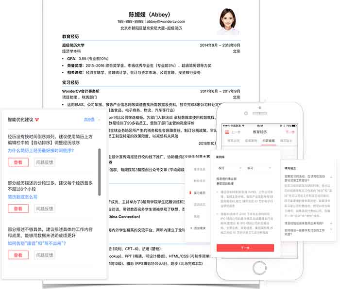 毕业生应聘还是职场人跳槽,超级简历对应不同群体有适合各自的模版。填写模版时每个项目都有指导和填写建议,相当于把简历改写服务变成一款线上产品。