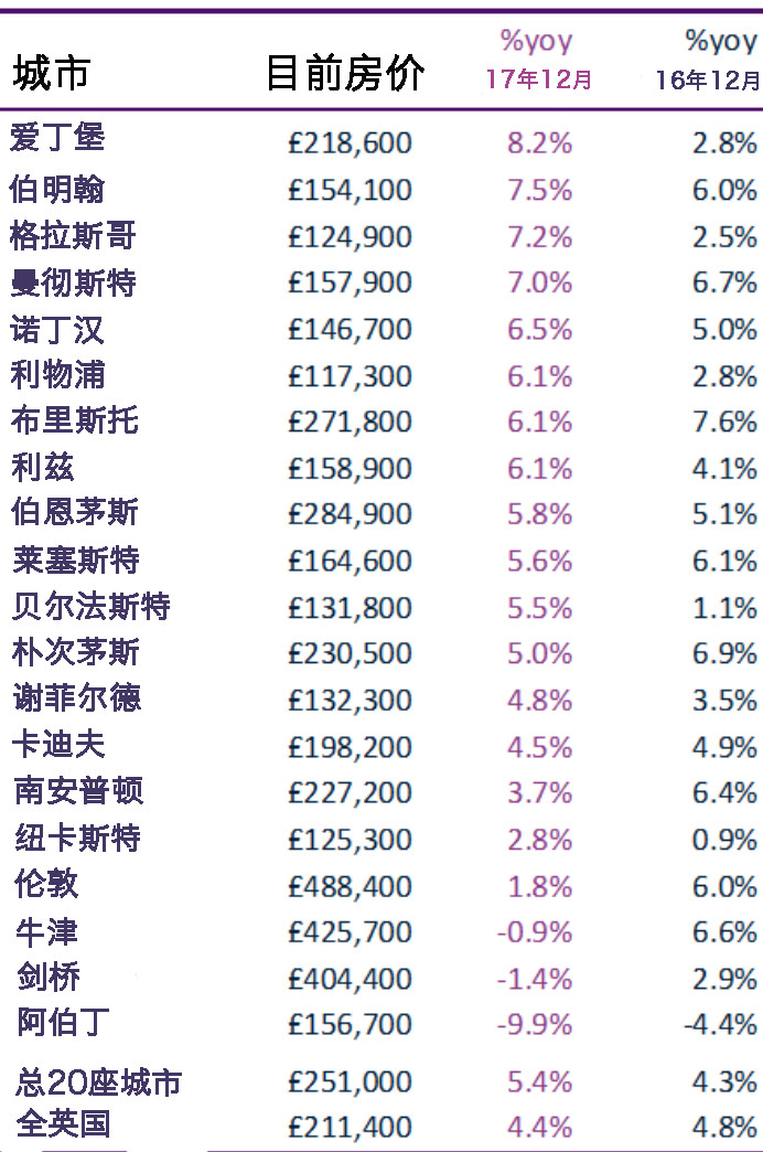 以下将根据Hometrack在这份排名中提供的购房均价、涨幅数据和英国地产网站Zoopla提供的在售房屋数据(截至2018年3月6日19:00),分别介绍英国目前房价涨幅最高的五座城市。