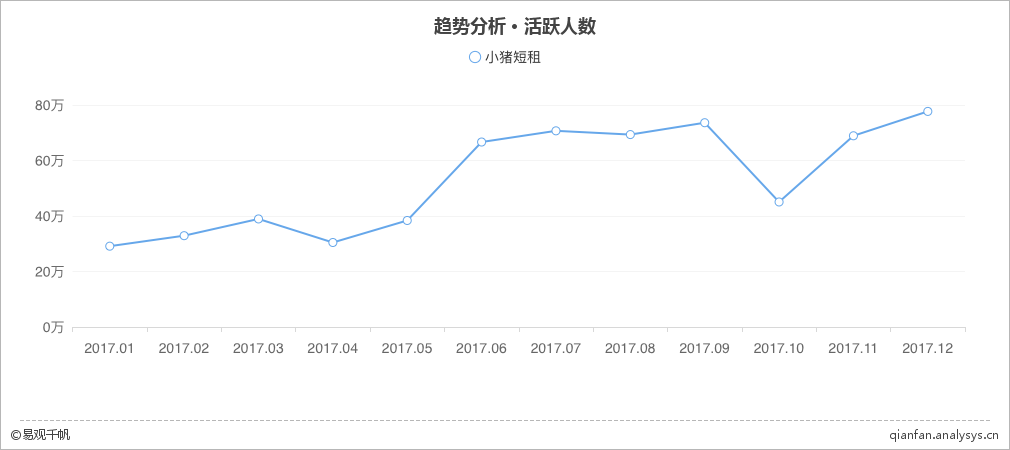另外,2017年小猪短租也在产品和活动两方面发力来增加用户。在产品迭代方面,优化房源搜索和详情页面提升体验,新增花呗分期和一网通支付改善支付手段,整合代金券入口等。在活动运营方面,利用签到得积分,积分兑换实用礼包,丰富礼包类别等手段刺激用户活跃度。多策略并行让小猪的月活跃用户从2017年年初的29.1万到12月的77.7万,实现了167%的增长。