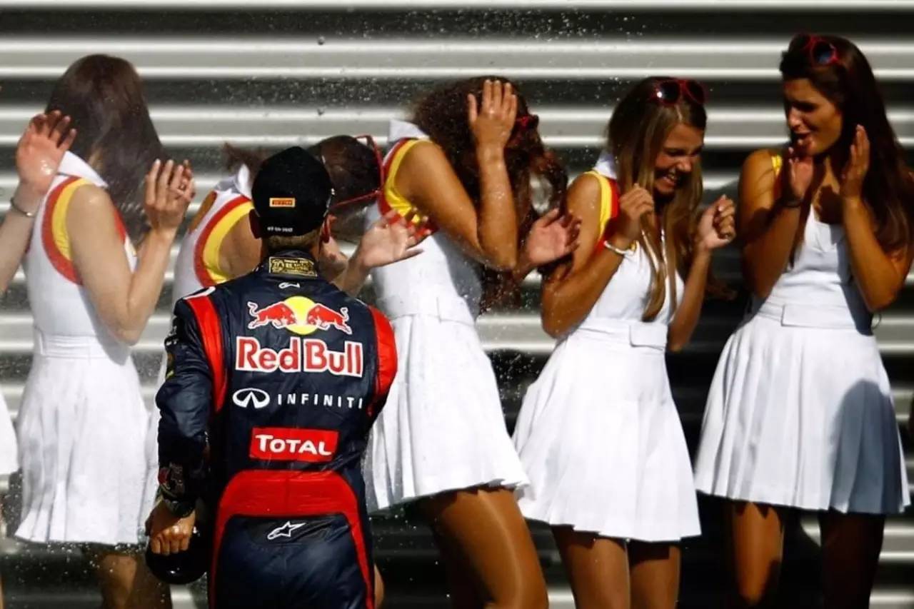 2012年9月2日,维特尔在F1比利时站夺冠后,对着赛道女郎喷洒香槟