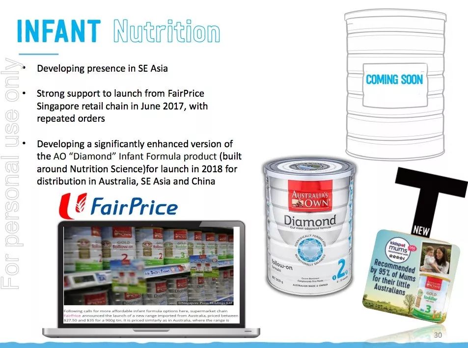 除了“澳牧”,值得注意的还有财报中关于奶粉工厂的介绍。自由食品透露,将在本月于Shepparton工厂着手建设一个混合和包装设施,以同时生产婴儿和成人营养品。该公司还表示,正和一个在中国的合作伙伴展开可能的合作,以帮助它取得中国食药总局的注册,这样它的婴幼儿配方奶粉就能卖到中国去。