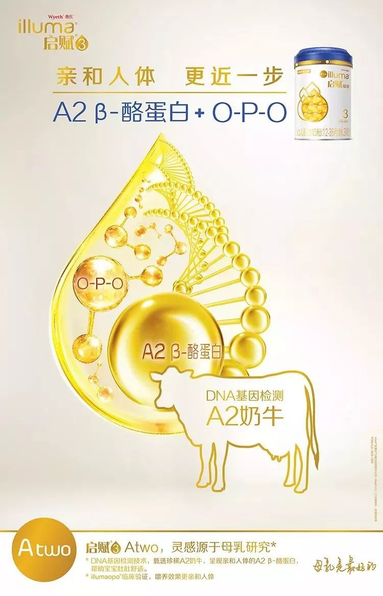 好了,回到今天文章开头的部分。今天,惠氏在其官方微信号上发文称“启赋3 Atwo超牛巨星来华”。根据其介绍,该品牌奶粉将推出“A2 β-酪蛋白+OPO结构脂配方”,又指其运用“DNA基因检测技术甄选珍稀”A2奶牛。